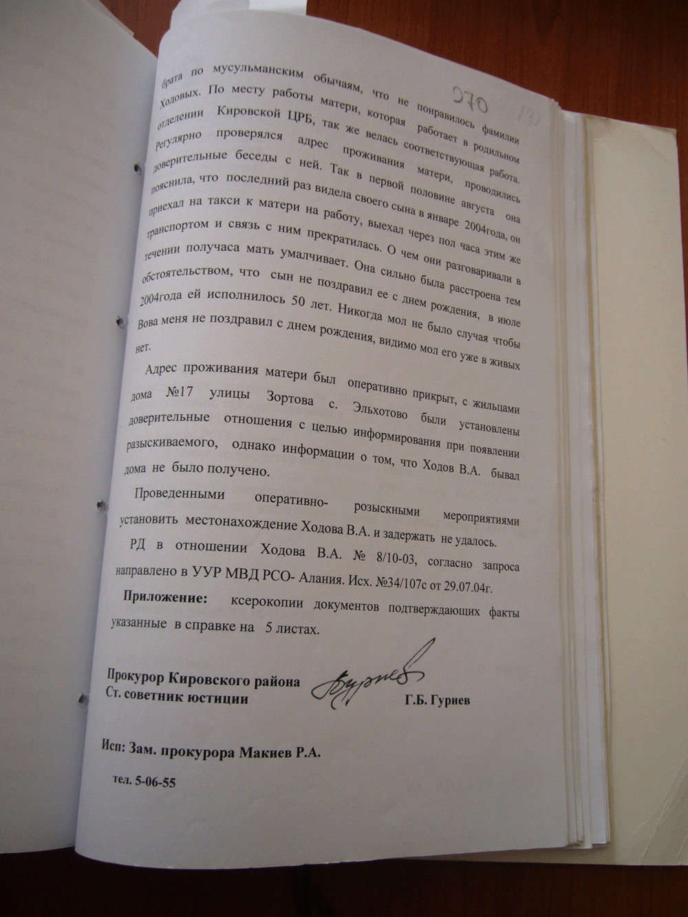 По идее это письмо должно было быть расценено как показания главного фигуранта по бесланскому делу и приобщено к материалам следствия. Его надо было тщательно проверить, тем более что о странной роли бесланского террориста Владимира Ходова стали говорить чуть ли не с 1 сентября 2004 года — сразу вычислили среди боевиков, и 3 сентября в Беслан была доставлена мать Ходова, проживающая в осетинском селе Эльхотово.