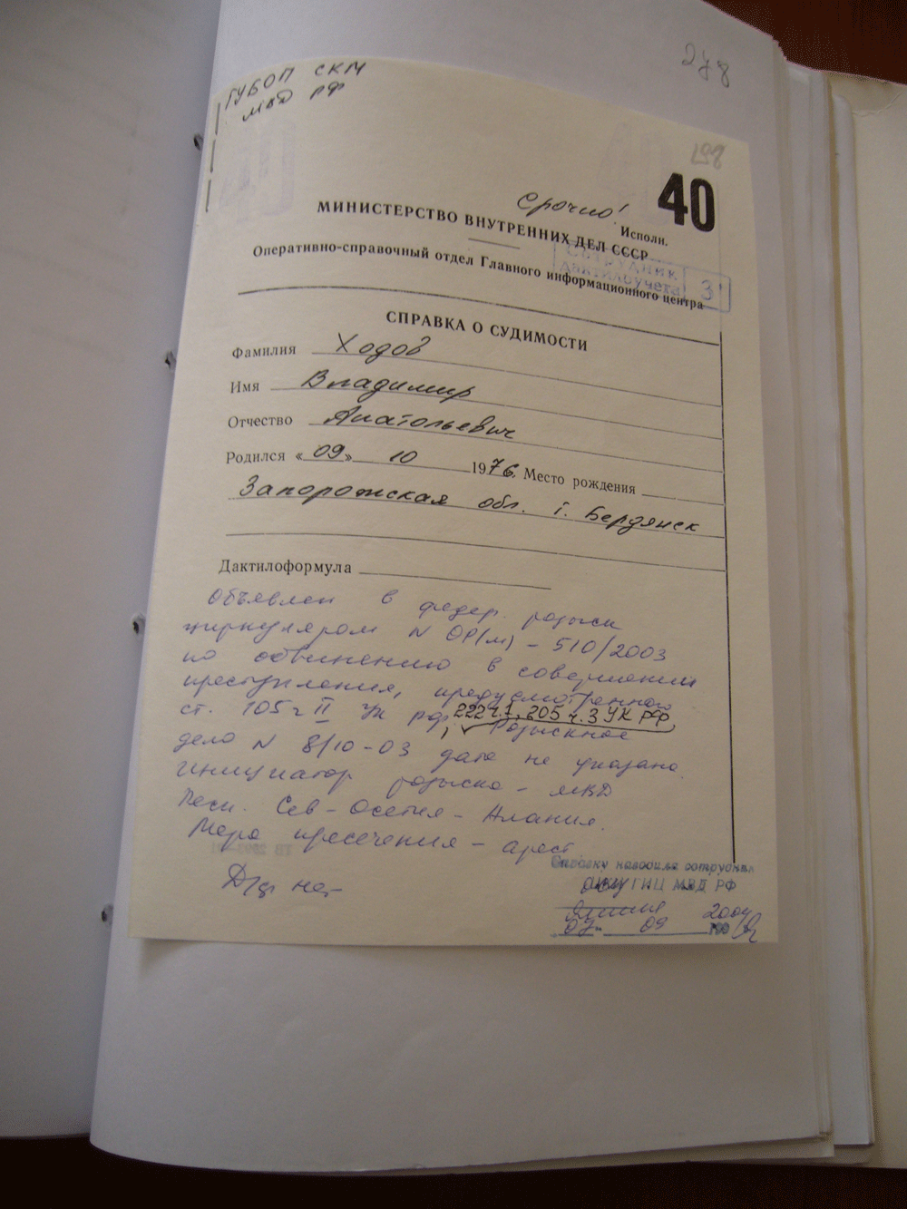 В материалах разыскного дела УВД г. Майкопа имеется письмо (от 06.08.2003 г…) о том, что в адрес заместителя начальника УБОП МВД республики Сохиева Р.Г. и.о. начальником УУР МВД РСО-А Ханжиевым А.Н. направлена факсом санкция на арест Ходова, однако в журналах входящей корреспонденции, в том числе секретной, указанного ведомства отметки о ее получении нет.