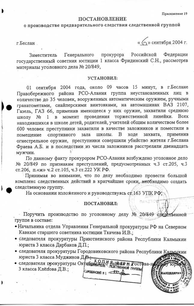 Основные документы о возбуждении уголовного дела по факту захвата заложников в СОШ № 1 г.Беслана и о проведении предварительного следствия.