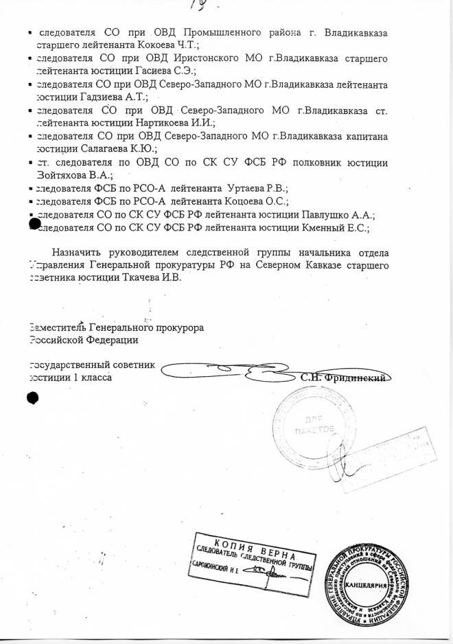 Основные документы о возбуждении уголовного дела по факту захвата заложников в СОШ № 1 г.Беслана и о проведении предварительного следствия.