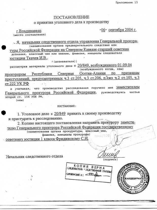 Основные документы о возбуждении уголовного дела по факту захвата заложников в СОШ № 1 г.Беслана и о проведении предварительного следствия.
